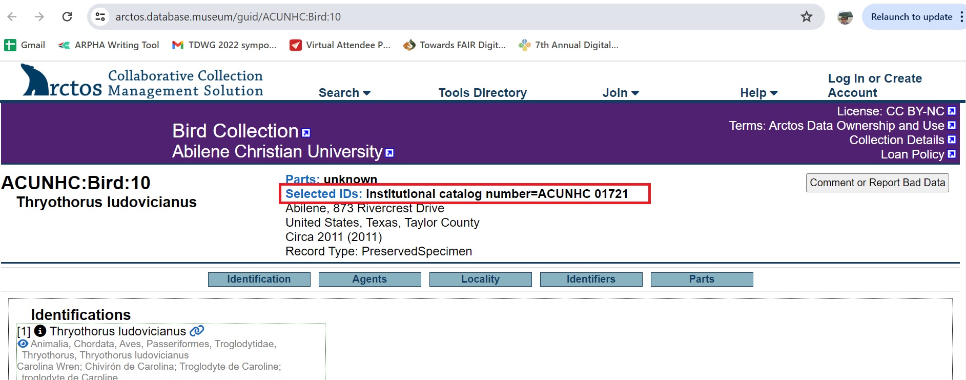 EXAMPLE: "New Mexico Museum of Natural History and Science Bird Collection. Individual catalog records should be cited by the catalog record url: https://arctos.database.museum/guid/NMMNH:Bird:1."